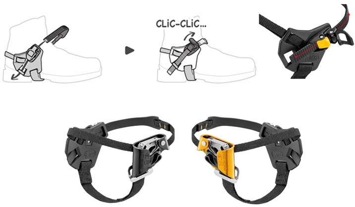 크롤 및 어센션과 함께 사용하는 발 고정 로프 등반기로서 간편하며, 정확한 조절과 최적의 착용감을 제공하며, 래칫 조절 시스템이 장착되어 빠르고 로프에 쉽게 설치하고 등반하는 동안 장비안에 고정할 수 있도록 캐치가 장착되어 있음