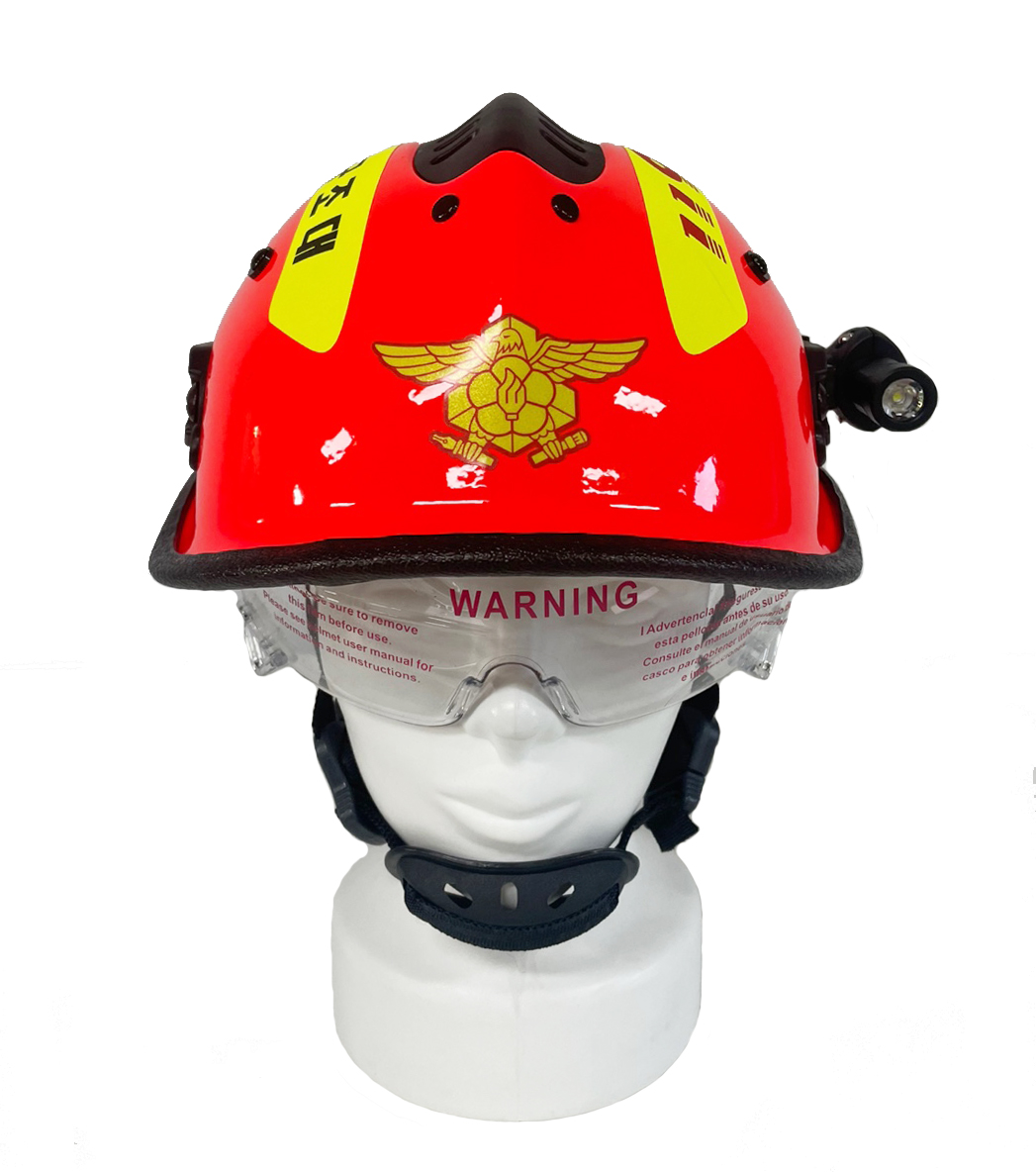산불 화재 현장에서 산불 진화 대원의 머리를 보호할 수 있는 헬멧. 고강도 케블라 재질이며, 내장형 고글이 부착되어 있어 각종 이물질 및 오염물 등에 대원의 눈을 보호할 수 있는 헬멧