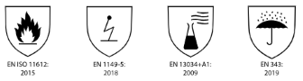 - 인 증 : EN ISO 11612:2015(열과 화염으로부터 보호 기준),